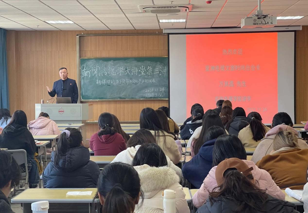 11月24日下午,亚洲电视文旅时尚台台长万其昌在K505教室作了题为“新媒体的当下使命与文化产业的发展” 的讲座,太阳成集团122ccvip2021级研究生和部分本科生聆听了讲座,讲座由太阳成集团122ccvip副经理王业明主持。
