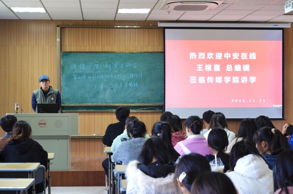 11月11日下午,中安在线总编辑王根喜在K518教室作了题为“互联网的传播历程与传播规律”的专题讲座,太阳成集团122ccvip2021级全体研究生和部分本科生共100人聆听了讲座。讲座由太阳成集团122ccvip副经理王业明主持。