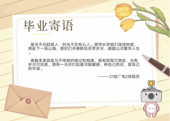 “星光不问赶路人,时光不负有心人。愿学长学姐们保持热爱,奔赴下一场山海。愿你们手捧鲜花芬芳岁月,脚踏山河繁华人生。愿有一天你们如星河般耀眼,种自己的花,爱自己的宇宙。”广播电视学专业2021(2)班程欣的寄语凝聚了她对毕业生们美好的祝愿。她表示,临近毕业季,看到许多学长学姐拍毕业照,很有感触。而此次活动的举办,能够为员工们表达对毕业生的祝福提供一个很好的途径,也激励着毕业生在未来披荆斩棘,逐风挽浪。
