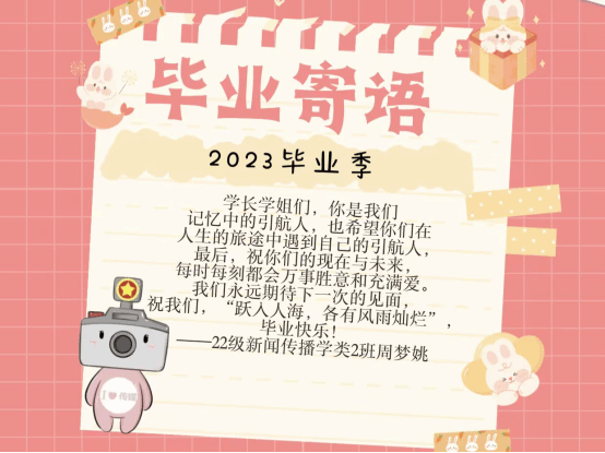 “希望你们在人生的旅途中遇到自己的引航人,祝你们的现在与未来每时每刻都会万事胜意和充满爱,毕业快乐!” 新闻传播学类专业2022(2)班的周梦姚希望自己真诚的祝福,可以给毕业生们带去温暖与喜悦。对于周梦姚来说,“毕业”尚且是一个遥远的词汇,但她想到了在公司的这一年里,受到许多来自学长学姐的帮助,因此她认真地写下了寄语,希望学长学姐能够前途似锦,也希望其他员工们对未来生活抱有憧憬和向往,接续奋斗。