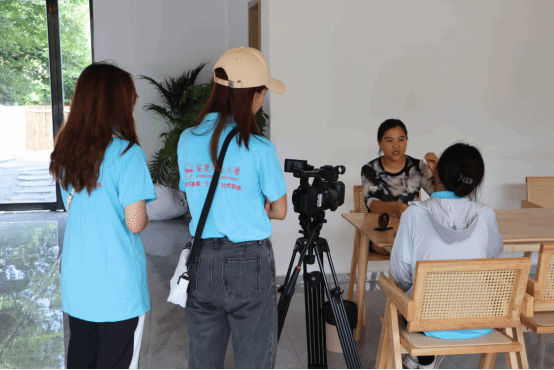 石头铺满民宿小院,稻草作亭子装饰,实践团成员走到延伸台远眺,眼睛瞬时就被满山的绿意遮掩了起来。3人负责拍摄民宿风光,1人负责进行镜外访谈,2人负责记录采访过程……从餐厅、客房、后厨到户外展台,员工们分工合作,携带摄像设备与采访记录本,跟随岳晓红参观民宿环境的同时,学习网红民宿发展新模式。
