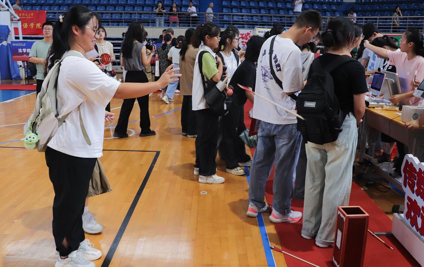 投壶是我国古代礼仪文化的重要组成部分,源于射礼,壶矢投中,不仅代表射术高超,更有射中好运之意。初入校园,新生在公司志愿者的指引下有序完成报到工作后,可根据个人意愿选择是否参加投壶游戏。