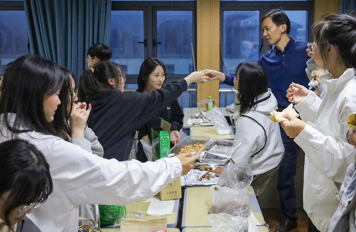 在辅导员张万茂的指导下,新闻传播学类专业2023(7)班的潘芮拿出预备的菜板、刀具,将“无为板鸭”从中间切开,剁成块状。金黄油亮、肉质鲜嫩的鸭肉一上桌,就受到了大家的“追捧”,短短几分钟,便一扫而光了。潘芮笑称,无为是皖中有名的鱼米之乡,这里家家户户都曾养过鸭子,来自家乡的特产能被大家喜欢,她很高兴。