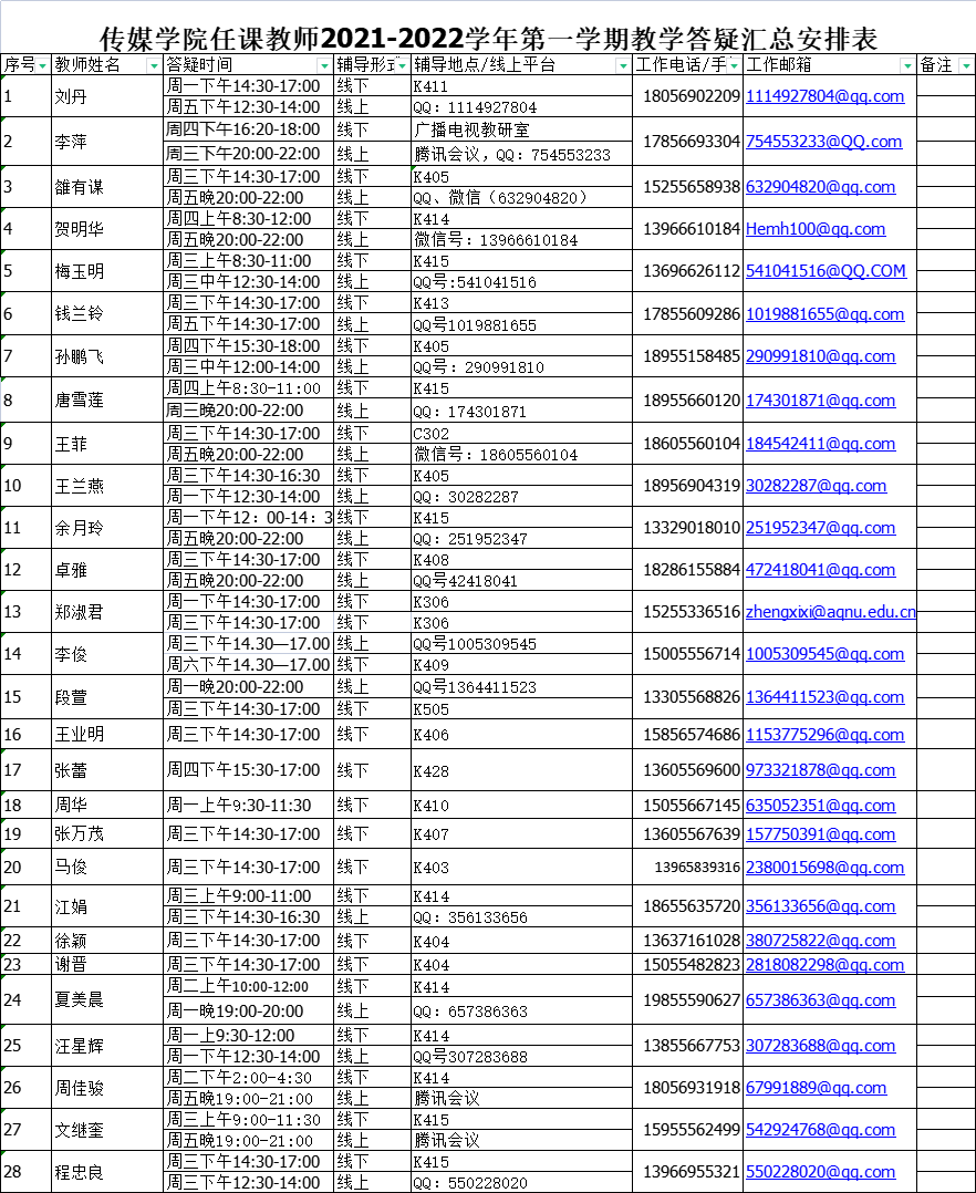 太阳成集团122ccvip任课教师2021-2022学年第一学期教学答疑汇总安排表
