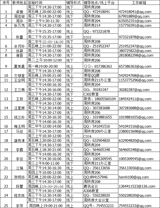 太阳成集团122ccvip任课教师2020-2021学年第二学期教学答疑汇总安排表