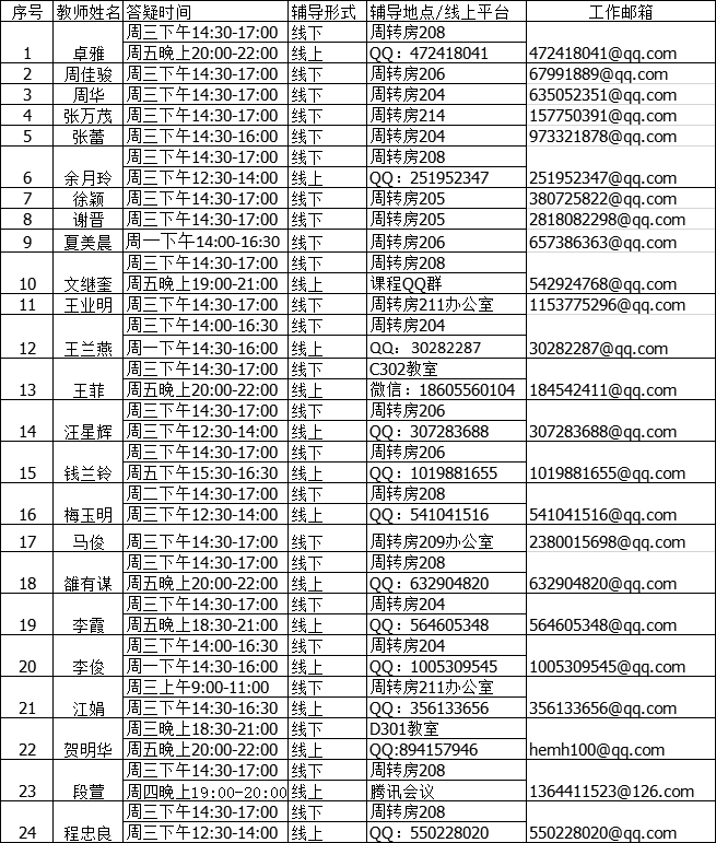 太阳成集团122ccvip任课教师2020-2021学年第一学期教学答疑安排