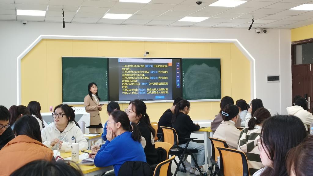 10月18日上午,卓雅老师的《电视作品分析》公开课在D306智慧教室举行。卓雅首先带领员工回顾了上次课程内容,简洁介绍了真人秀的界定与类型,随后梳理了中国电视综艺的发展,并在“雨课堂”设置相关问题,限时作答,增加了课堂的互动性。她最后以《中餐厅》第三季为例,回顾真人秀的构成要素以及如何评析真人秀。