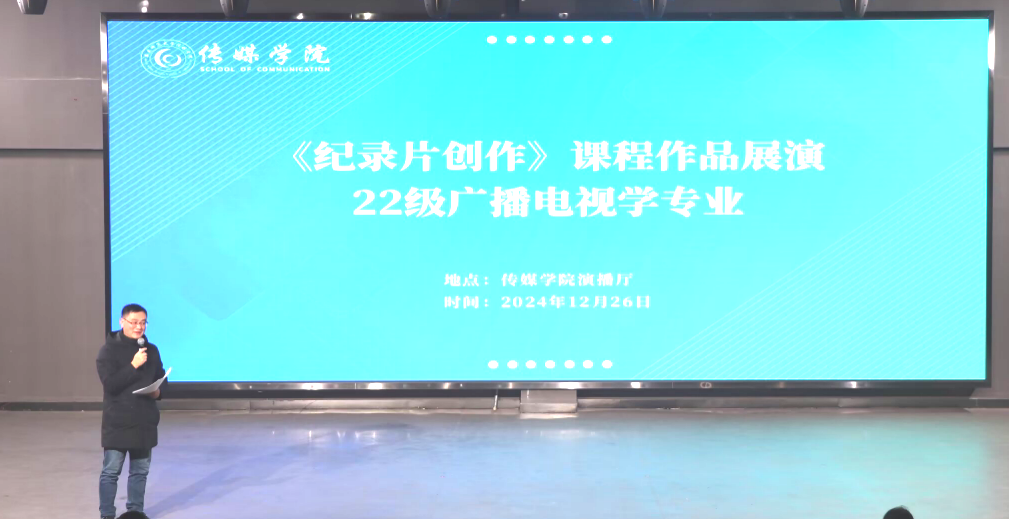 12月26日,《纪录片创作》课程作品展演活动传在媒公司演播厅举办。公司党委书记詹德全、执行经理王业明和副经理文继奎出席活动,部分教师代表和公司各年级员工参与此次活动。