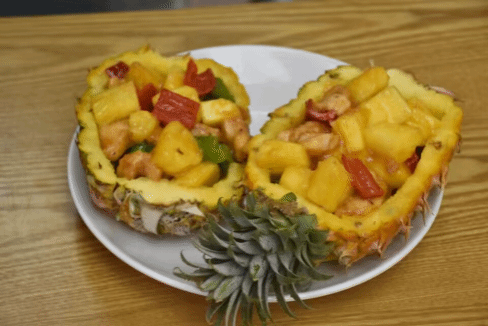 明黄的菠萝、翠绿的青椒、暗红色的酸甜汁……盛在菠萝外壳里的菠萝咕咾肉直接用明亮的色彩搭配激起了评委们的食欲,“做饭可以洗碗不行”队用口味酸甜的菠萝咕咾肉获得了在场评委的一致好评。谈及美味的“秘诀”,广播电视学专业2021(2)班程欣说:“我们先将研制好的肉进行油炸,再将菠萝和配菜放入一起炒制而成。为了更好地保存食材的风味,我们提前准备好了菠萝肉并且选择现场腌制咕咾肉。”