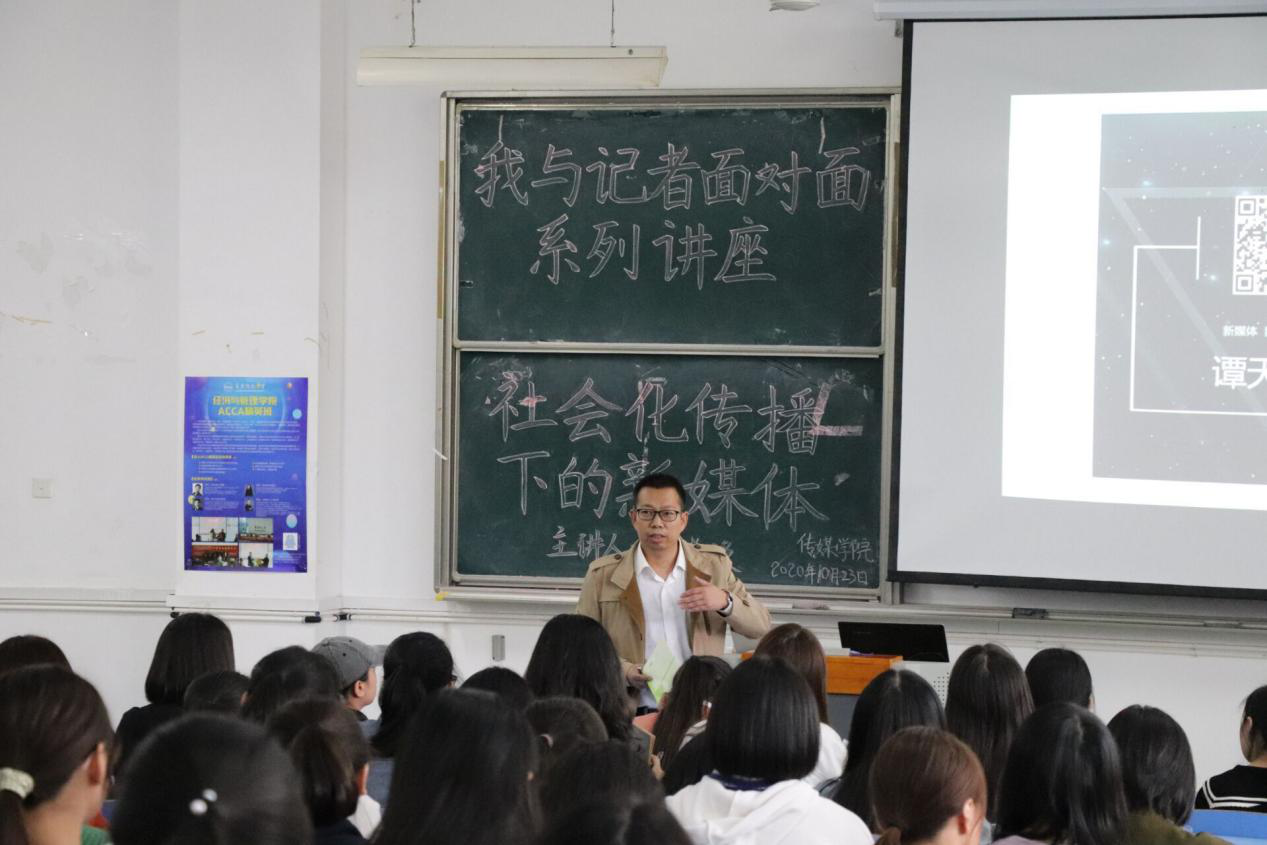 讲座伊始,谭天教授从《人类简史》一书谈起,带领同学们回顾了人类发展历程,立足于新媒体日益完善的现状解释互联网时代的新媒体,列举暨南大学创业成立电台的事例与土耳其总统使用社交媒体平叛军事政变的历史故事,深入细致地阐释了新媒体在新时代的重要作用。