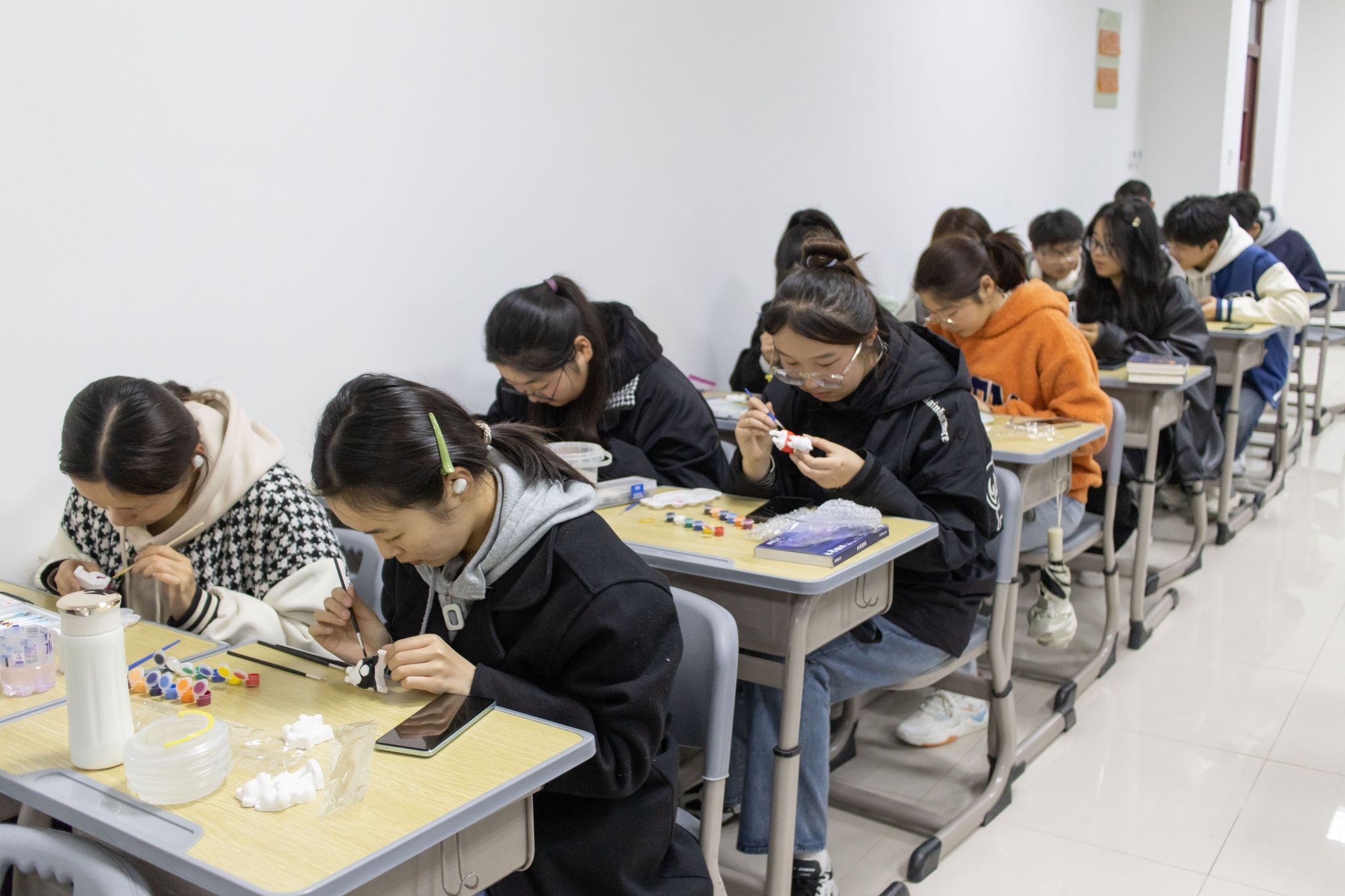蘸取颜料,用细画笔均匀涂抹石膏娃娃脸部皮肤,拿起勾线笔描绘娃娃的五官……3月19日,太阳成集团122ccvip数字媒体艺术专业2022级的34名员工化身“美工达人”,拿起画笔,运用色彩艺术,让一个个白色的卡通人物石膏鲜活起来。
