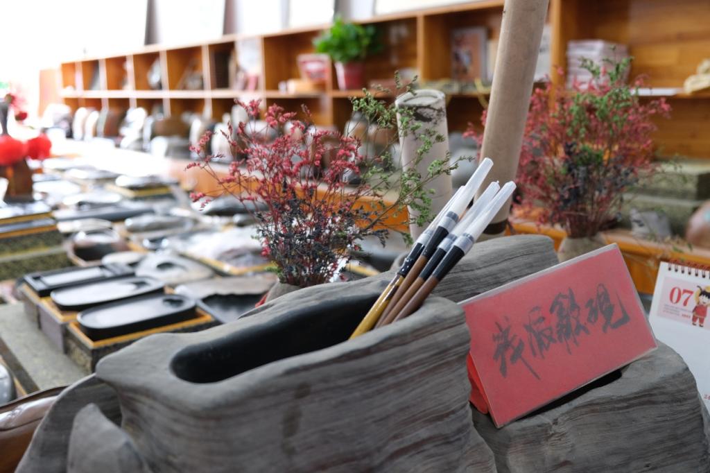 一方正宗的歙砚需历经选料、制坯、磨坯、设计、刻线、起线、开池、雕刻、打磨、落款、配盒等多道工序,几乎所有工序都需要纯手工完成。平刀、锉刀、锤子……制作歙砚的工具加起来有30多种,每一样工具都有其特殊的作用。从一块石头变成一方歙砚十分耗时耗力,年近六十的他依然坚持每天六七个小时“扎”在石头堆里自由创作,店内的展品全部是自己亲手制作。