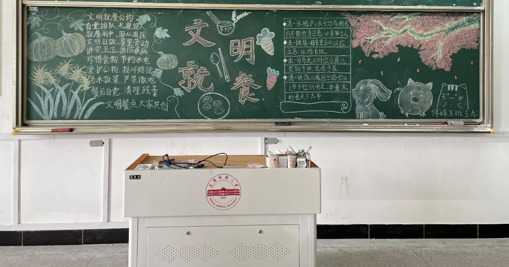 “粒米虽小犹不易,莫把辛苦当儿戏”,这是新闻传播学类2021(3)班的黑板报作品主题。据班级黑板报解说员、新闻传播学类专业2021(3)班的刘佳欣介绍,制作黑板报的员工们克服了资料有限、材料有限等困难,从文字内容、排版、图画三方面入手,着重突出了农民伯伯的形象,并以树叶、麦穗等元素作为辅助。“我们在板报中提出了在餐厅‘文明就餐’的意义,以一首耳熟能详的古诗警示大家,又以倡议书再次倡导大家‘文明就餐’。”