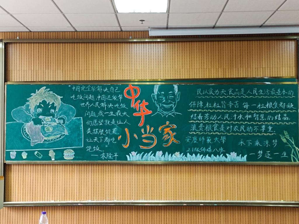 新闻传播学类专业2021(5)班将“食为政首,粮安天下”作为本次黑板报的主旋律。谈及黑板报的策划和想法时,新闻传播学类专业2021(5)班的付敏作为板报解说员说:“右侧延伸出来的樱花树和散落的樱花以及可爱的小动物,表达我们对文明就餐活动的殷切期望和对文明就餐习惯在安庆师大校园蔚然成风的坚定信念。”她表示,除了板报样式外,他们还通过古文对于文明就餐的一些观点进行展示,希望引发大家的共鸣与思考。”