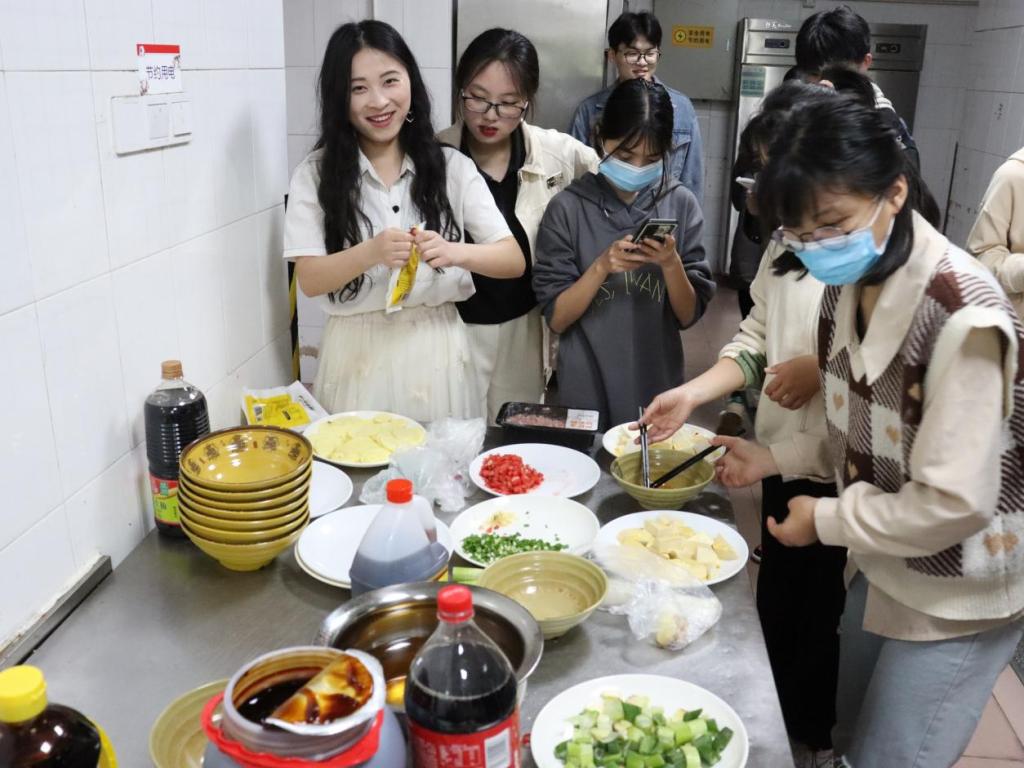 “火应该开大一点!”“划重点,炒饭呈金黄色!”“蛋皮要煎得滑嫩!”……新闻传播学类专业2021(2)班的许丽化身队伍的掌勺“大厨”,一边做菜一边向队友传授自己做蛋包饭的“独门秘籍”。借蛋包饭怀念家的味道是她参加本次比赛的初衷,“我经常在家吃爸妈做的蛋包饭,现在好久没有回家,我只能自己动手,看着色香味俱全的蛋包饭,心里说不出的满足。”