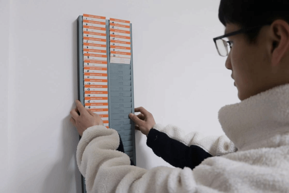 整理摆放桌椅,确定放置位置,撕下挂钩底纸,安装打卡卡袋……3月17日下午,以新闻学专业2020(2)班王士凌为代表的主席团成员们到达考研自习室,合作将打卡机安装好。为了不打扰自习的员工,他们一边低声交流,一边寻找最便利员工打卡的方式。安装完成后,他们亲自体验打卡,确保打卡袋的稳固性以及打卡机器的正常使用。不到半小时,两个教室的打卡机全部安装完毕。