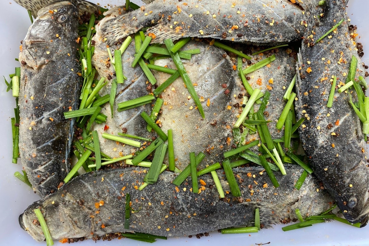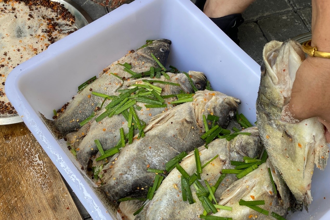 将新鲜鱼洗净、剪开鱼肚、抹盐、在木桶里面腌制,最后将鱼放在室温25℃左右的环境中,一位厨师向团队成员们展示了腌制臭鳜鱼的过程。“臭鳜鱼是徽菜的招牌之一,它的来历可追溯到200多年前。当时在安徽沿江一带的居民大多数是靠打鱼为生。冬天,鱼贩们会把鱼用木桶装起来,然后贩卖到徽州山区,由于当时交通不发达,运送时间长,所以鱼贩们就在鳜鱼上撒一层盐来保持鱼的鲜嫩。”餐馆经营人王正平向成员们介绍有关臭鳜鱼这道徽菜的来历。