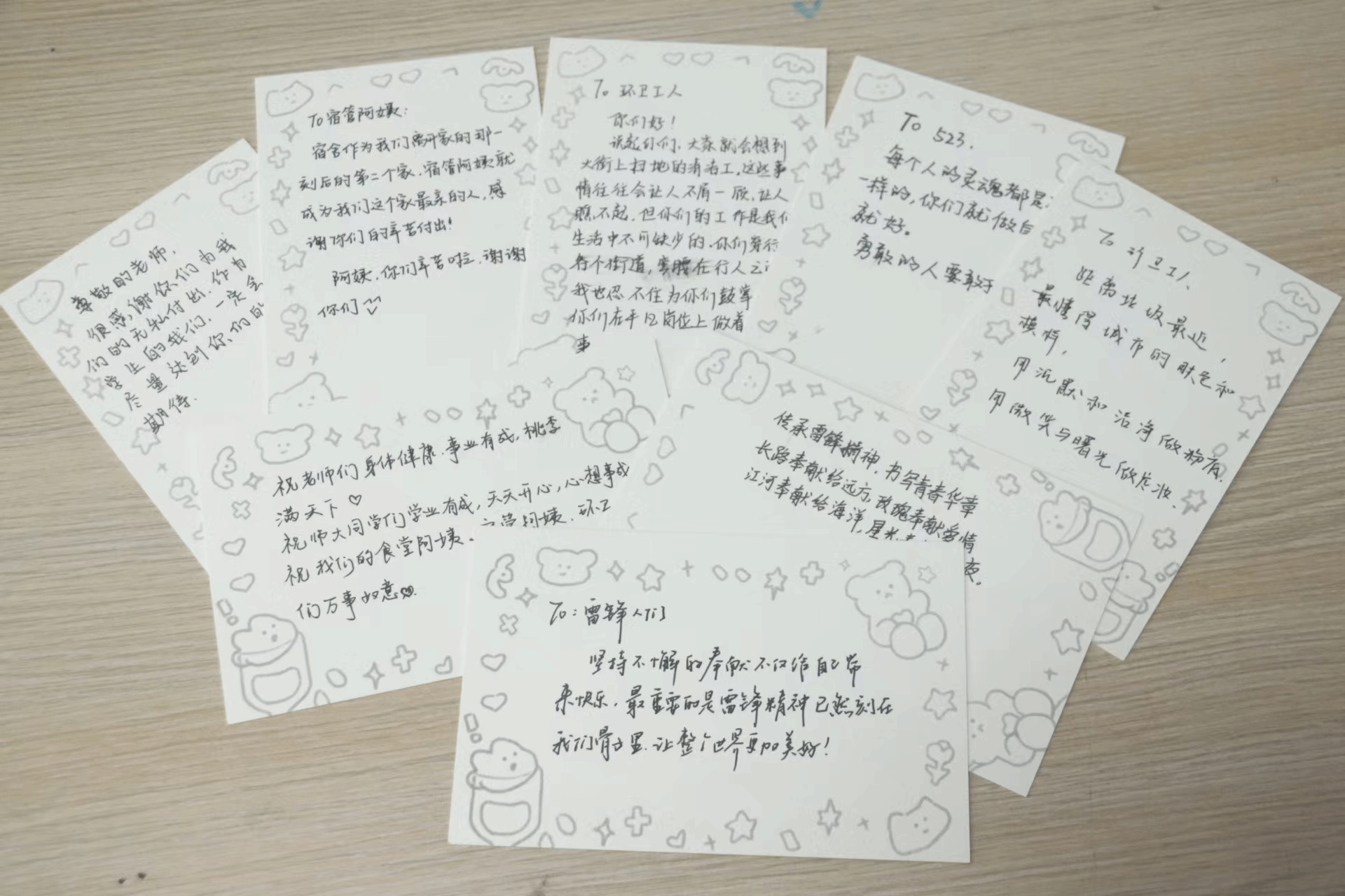 “感谢你的无私付出”、“祝愿你们事事顺心、万事如意”“祝大家平安喜乐”……随着活动的深入,越来越多的员工加入到写明信片的行列中,将手中的明信片写给他人,“我是写给宿舍阿姨的,在离开家后宿舍阿姨就成为我们在公司生活中最亲近的人,关注着我们的生活起居、生命安全,为我们服务着,所以我也想借此机会向她们表示感谢,谢谢她们的辛苦付出。” 新闻传播学类专业2023(2)班余越说,“在参与这次活动的时候,我想到了很多曾经忽略的习以为常的事情,都是身边的人默默在做,我之后也会对他们时常保持感恩之心。”