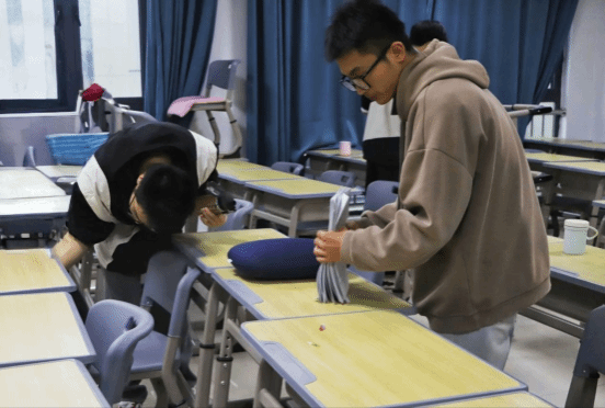 整理桌椅、擦拭桌面、清理地面……数字媒体艺术专业2023级陈正忙得不亦说乎,他说到自己平时做过简单的家务活,这对他来说非常轻松。不到一个小时,自习室已打扫完毕。“通过我们的努力为考研的学长学姐提供一个良好的学习环境非常有意义。另外这次活动也给我们提供了一个锻炼的机会,未来我也会多多参加此类活动,践行志愿服务精神。”他分享到。