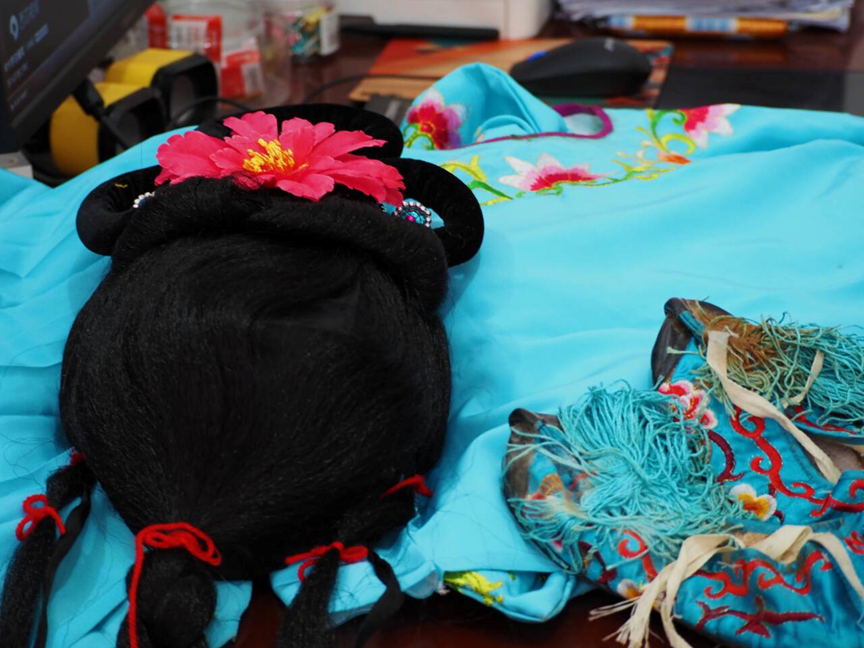 实践团了解到在打秋千表演时,四个女孩子会扮作秋千姑端坐在秋千架上,由十个青壮年推着,沿三阳老街、新街、巷里巷外,边荡边唱。村干部潘永红向实践团展示了秋千姑所着装的衣服并邀请实践团成员们进行体验。