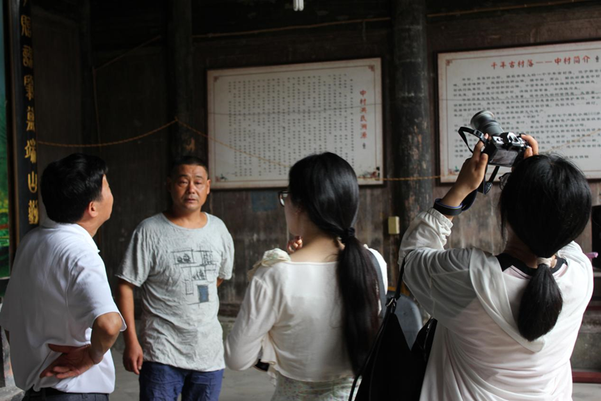 洪氏宗祠是明清时期的古建筑,也是三阳镇重要的非物质文化遗产,具有较高的建筑研究价值和文化特色。在中村村支部书记吕彦水的带领下,实践团来到中村洪氏支祠进行参观。祠堂梁柱上“倒挂莲花”的雕刻和寓意“多子多福”的冬瓜梁,生动而又含蓄,展现了明清时期的高超技艺和建筑艺术。在退休教师洪韶光的引导下,实践团还参观了宗祠的墙面,其中以“芦苇把”为建筑材料的设计,生动展现了中村人民与自然和谐共生的智慧。