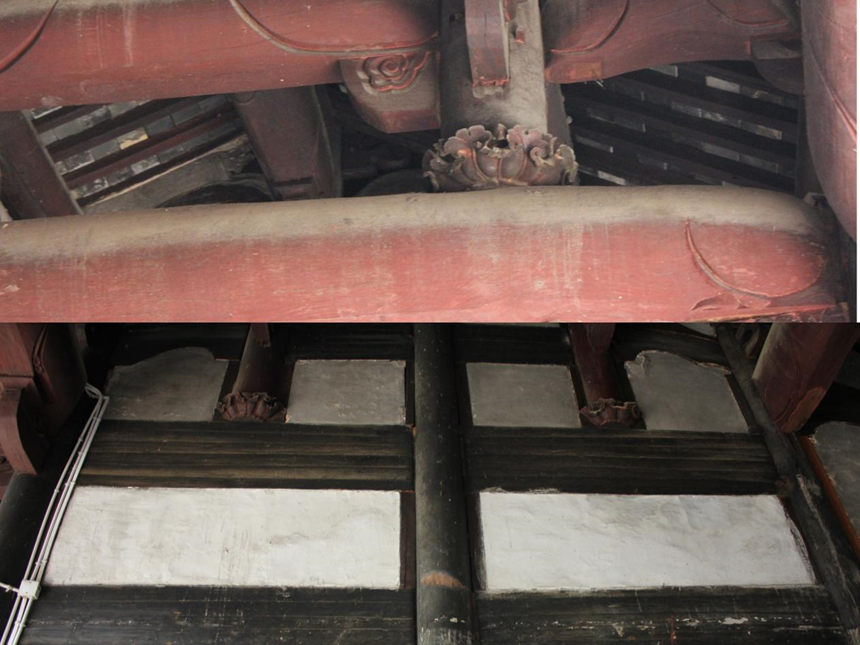 图为“倒挂莲花”雕刻和宗祠墙体